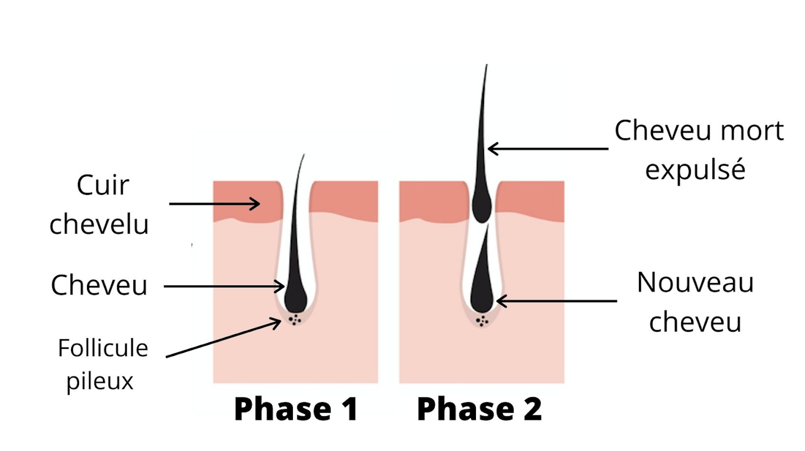 | Alors restez bien avec moi !9 chutes de cheveux sur 10 sont causées par un déséquilibre hormonal¹Il y a deux phases clés dans le cycle de vie de vos cheveux : 1- La croissance ou la pousse 2- La chute Chaque cheveu vit son propre cycle indépendamment de ses voisins. C’est pour ça qu’en temps normal, la repousse compense la chute. |